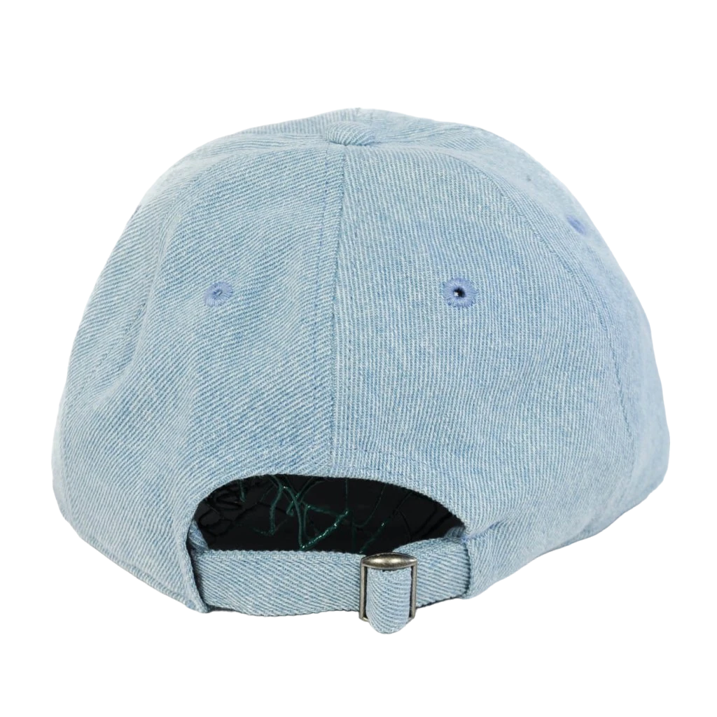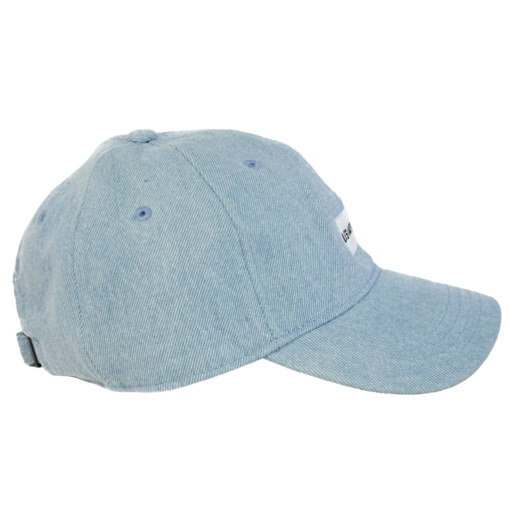 LES (ART)ISTS – Box Logo Strapback. Lys denimblå kasket i 100% bomuld. Buet skærm, størrelsen justeres med et strapback-spænde. One size.